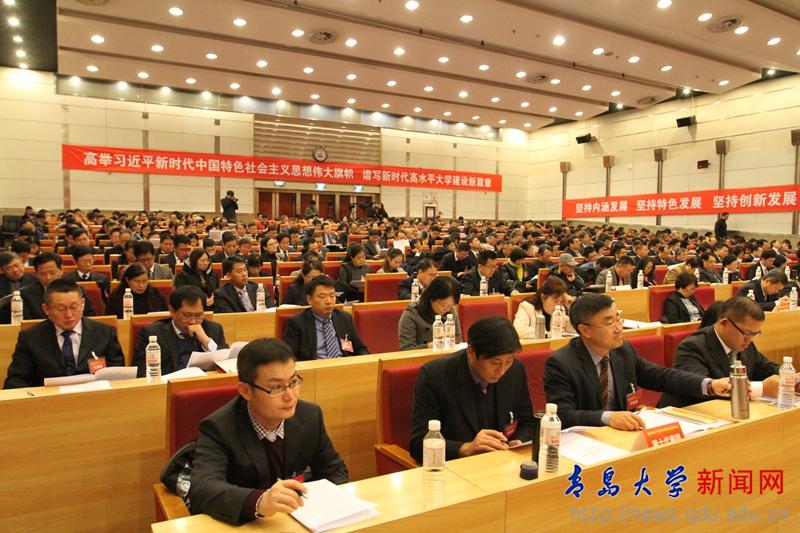 第三次代表大会”的会标,后幕正中是镰刀和锤头组成的党徽,10面鲜艳的红旗分列两侧。会场两侧分别悬挂着“坚持内涵发展 坚持特色发展 坚持创新发展 坚持以人为本 坚持追求卓越”“在服务山东新旧动能转换中求发展 在国家“双一流”建设中求突破”的横幅,会场后面悬挂着“高举习近平新时代中国特色社会主义思想伟大旗帜 谱写新时代高水平大学建设新篇章”的横幅。