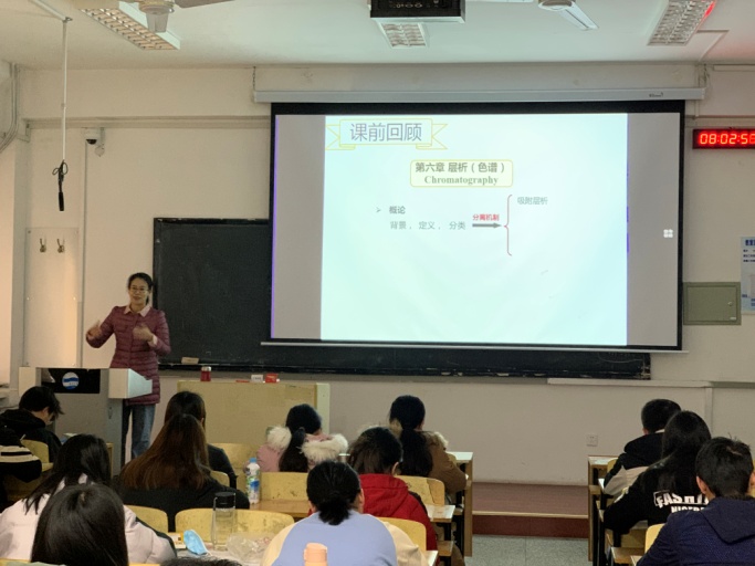 郭老师首先简要回顾了上节课重点内容,即吸附层析的分离原理。在梳理知识点的过程中,郭老师灵活运用雨课堂,师生之间弹幕互动答题,极大地活跃了课堂气氛,激发学生的学习兴趣。课上,郭老师还带领学生精读相关英文文献,同时介绍了英文论文的写作技巧,学生们认真记录。