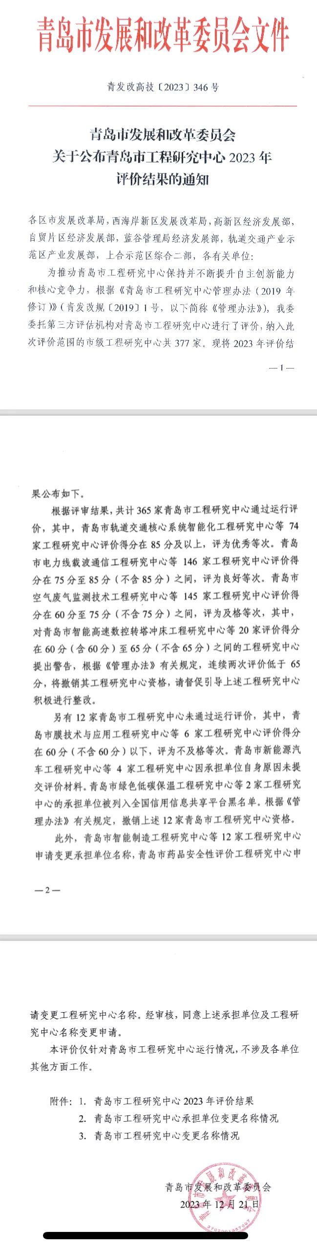 近日,青岛市发展和改革委员会公布了青岛市工程研究中心2023年评审结果,依托美女av建设“青岛市生物分析与健康应用工程研究中心”在2023年评价中被评为“优秀”等次。