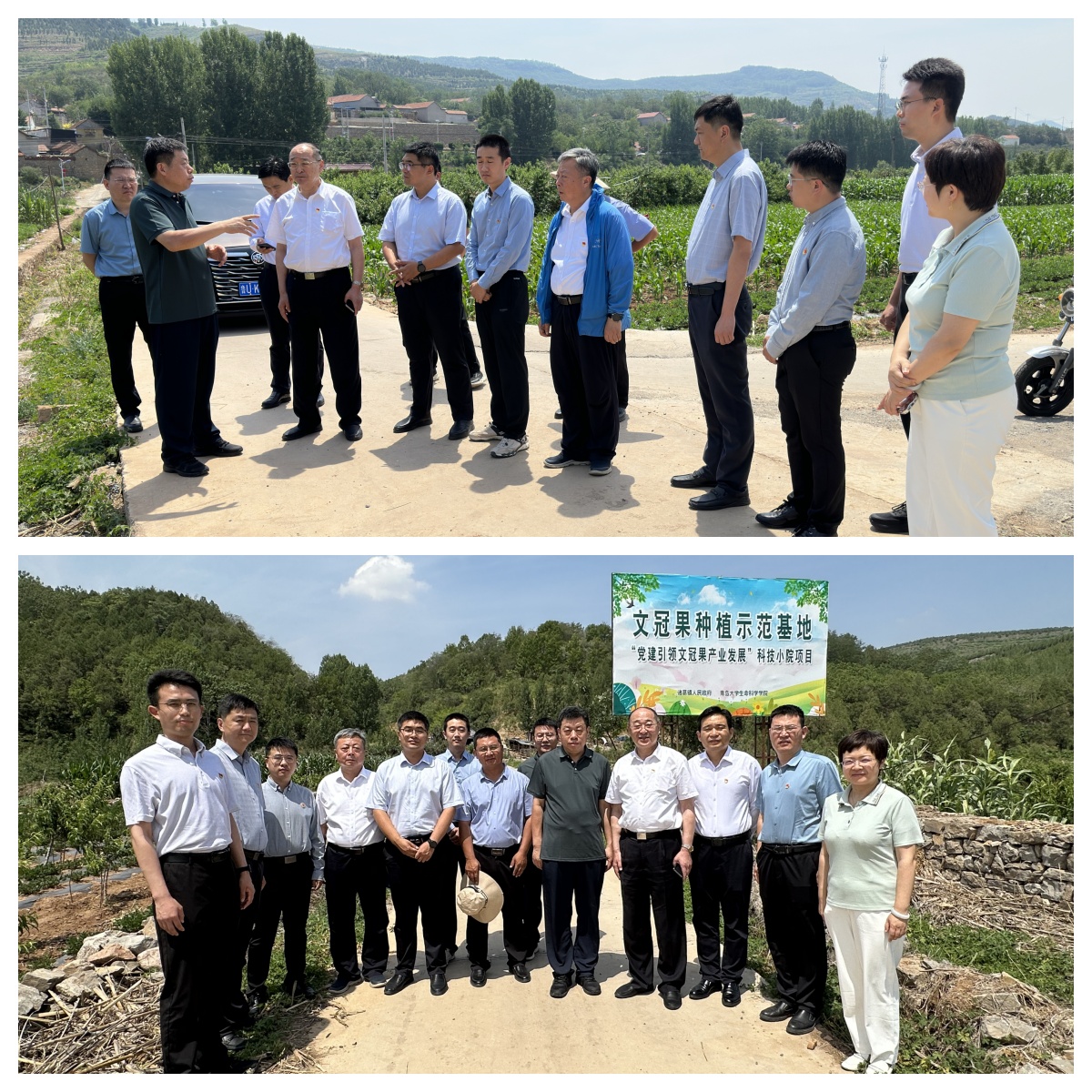 会前,在诸葛镇大崖头村支部,薛冰一行实地查看了双方合作的文冠一期试验田,并听取诸葛镇有关人员介绍项目未来规划。下一步,学院将以此次合作项目的顺利落地为契机,秉承“校地合作、相互促进、平等协商、互利共赢”的原则,不断探讨和扩大合作领域,持续深化校地协同创新,为沂水县高质量发展提供科技人才支撑。