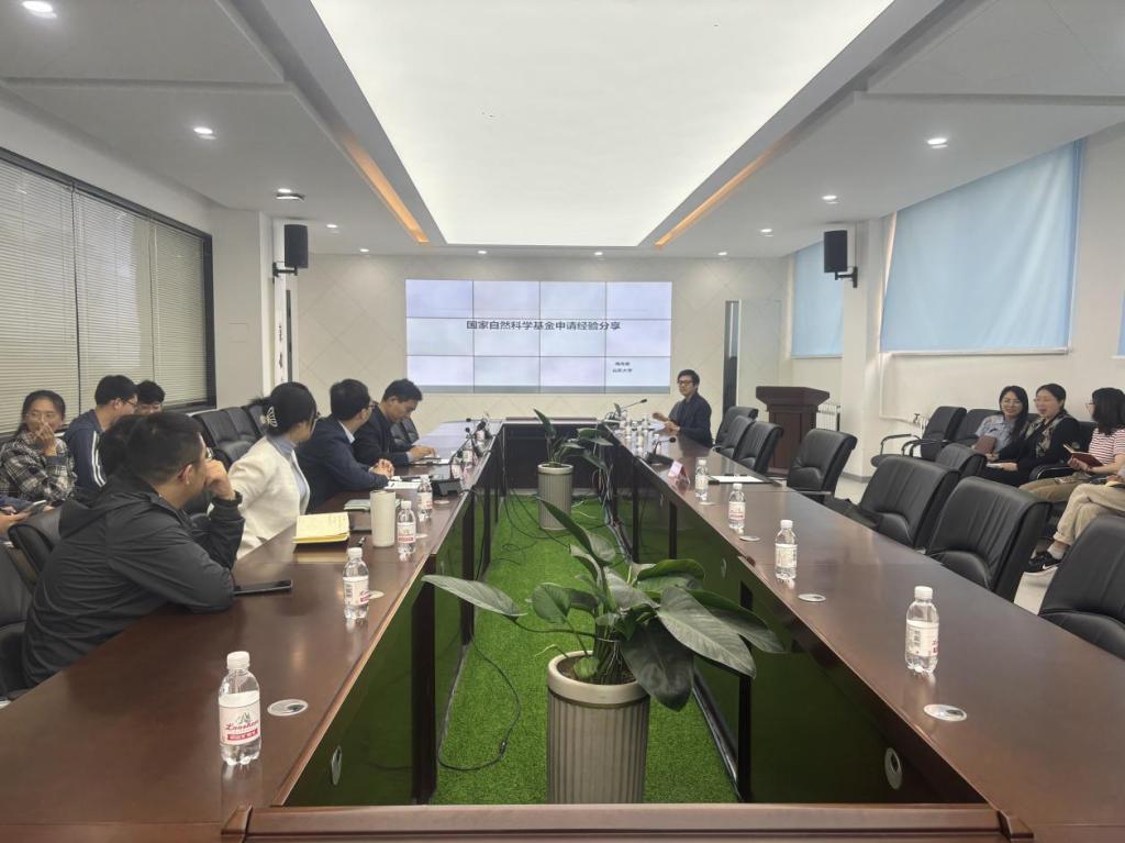 教授周传恩教授参会并作基金申报经验分享的主题报告, 学院2024年度国家自然科学青年基金获得者万昊、臧绍青老师同场作经验分享。学院党委书记孙建华、副院长孙海新及学院教师参加本次活动,党委书记孙建华主持。