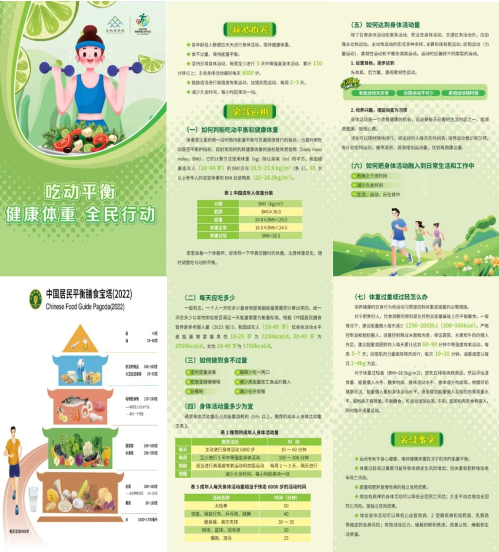 精心准备了制作了120份中国营养学会发布的全民营养周宣传折页,内容涵盖中国居民膳食宝塔(2022版)、吃动平衡核心推荐、如何判断吃动平衡和健康体重、每天应该吃多少、身体活动量、如何把运动融入日常生活、体重过重、过轻怎么办等。