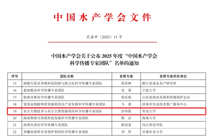 水生生物技术研究院沙珍霞教授牵头申报的“水生生物技术与水生生物资源利用科学传播专家团队”成功入选,成为全国22个获此殊荣的团队之一。