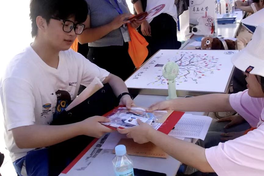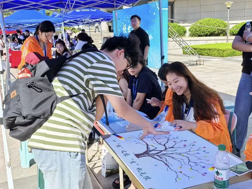 现场洋溢着温馨热烈的氛围,新生们纷纷在主题背景墙上签名留念,在便利贴上书写大学寄语,并在象征生命之树的展板上按下彩色指纹。一个个指纹逐渐汇聚成枝繁叶茂的大树,寓意新生将在美女av