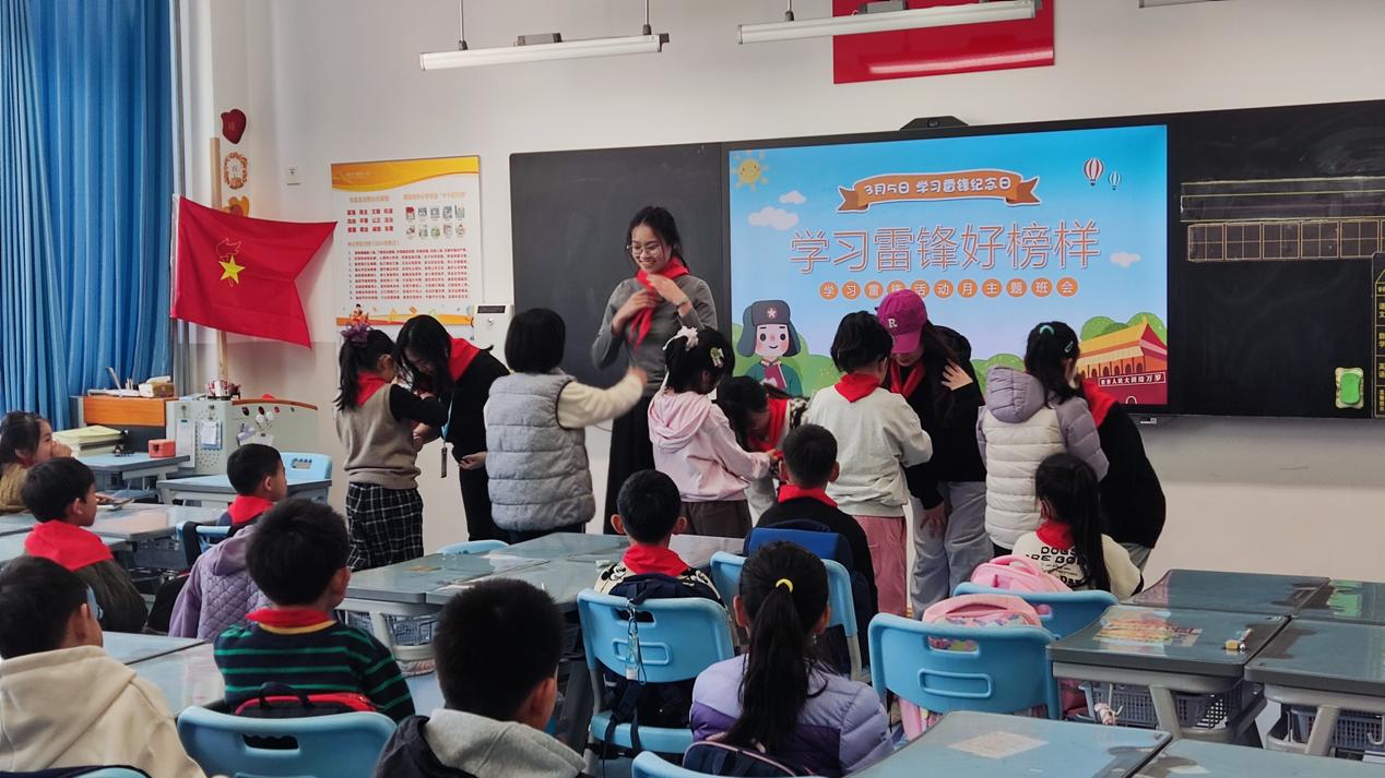 宣讲开始前,五位优秀可爱的小朋友代表为志愿者们佩戴红领巾,展现了他们的热情,表达了对志愿者们的欢迎。随后,宣讲开始,志愿者向小朋友们生动形象地讲述了雷锋同志的故事,将他的人生经历和乐于助人的先进事迹娓娓道来,并科普了学雷锋纪念日的来源和意义,鼓励小朋友们向雷锋同志学习。同时,志愿者还引导小朋友们在日常生活中要互相帮助,德、智、体、美、劳全面发展,在将来成为对社会和国家有益的人,为祖国的建设和发展添砖加瓦。