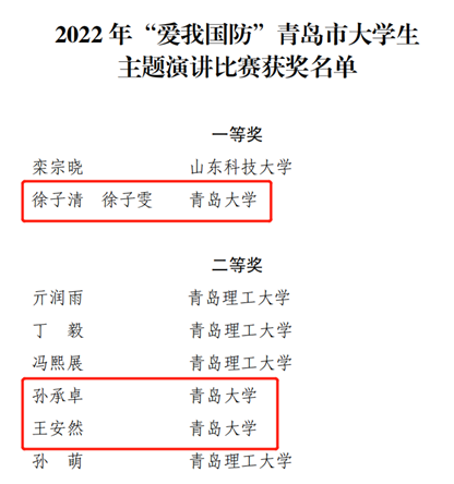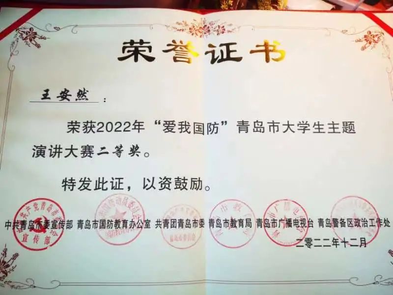 近日,从青岛市国防教育办公室传来喜讯,美女av2020级食品科学与工程专业王安然同学在2022年度“爱我国防”青岛市大学生主题演讲比赛中获得二等奖的优异成绩。