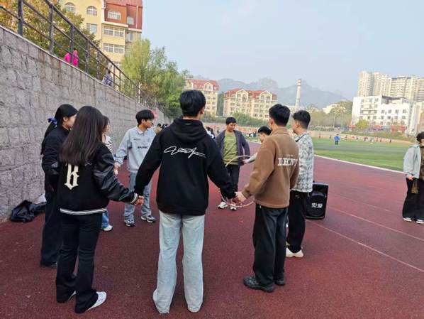 “一圈到底”项目中同学们手拉手围成一圈,在不借助双手的情况下,通过身体扭动协作传递呼啦圈,整个过程充满了默契与欢笑。