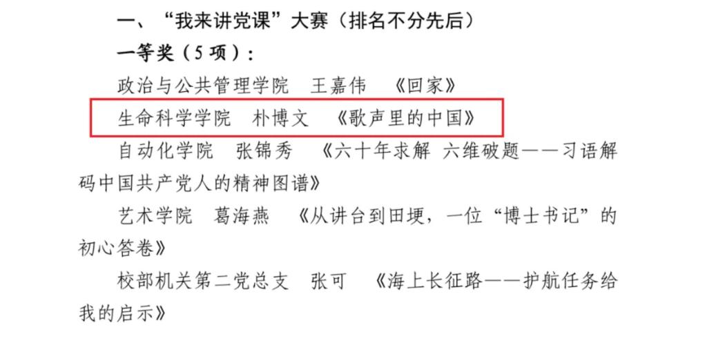 在“我来讲党课”比赛中,朴博文老师以《歌声里的中国》为题,通过解读音乐作品中的红色基因,再现党的奋斗历程,以歌叙史、以曲传情,深情歌颂党的辉煌成就与祖国的大好河山,实现了思想教育和艺术表达的有机统一,呈现了一堂有情感、有声音、有思想的党课。