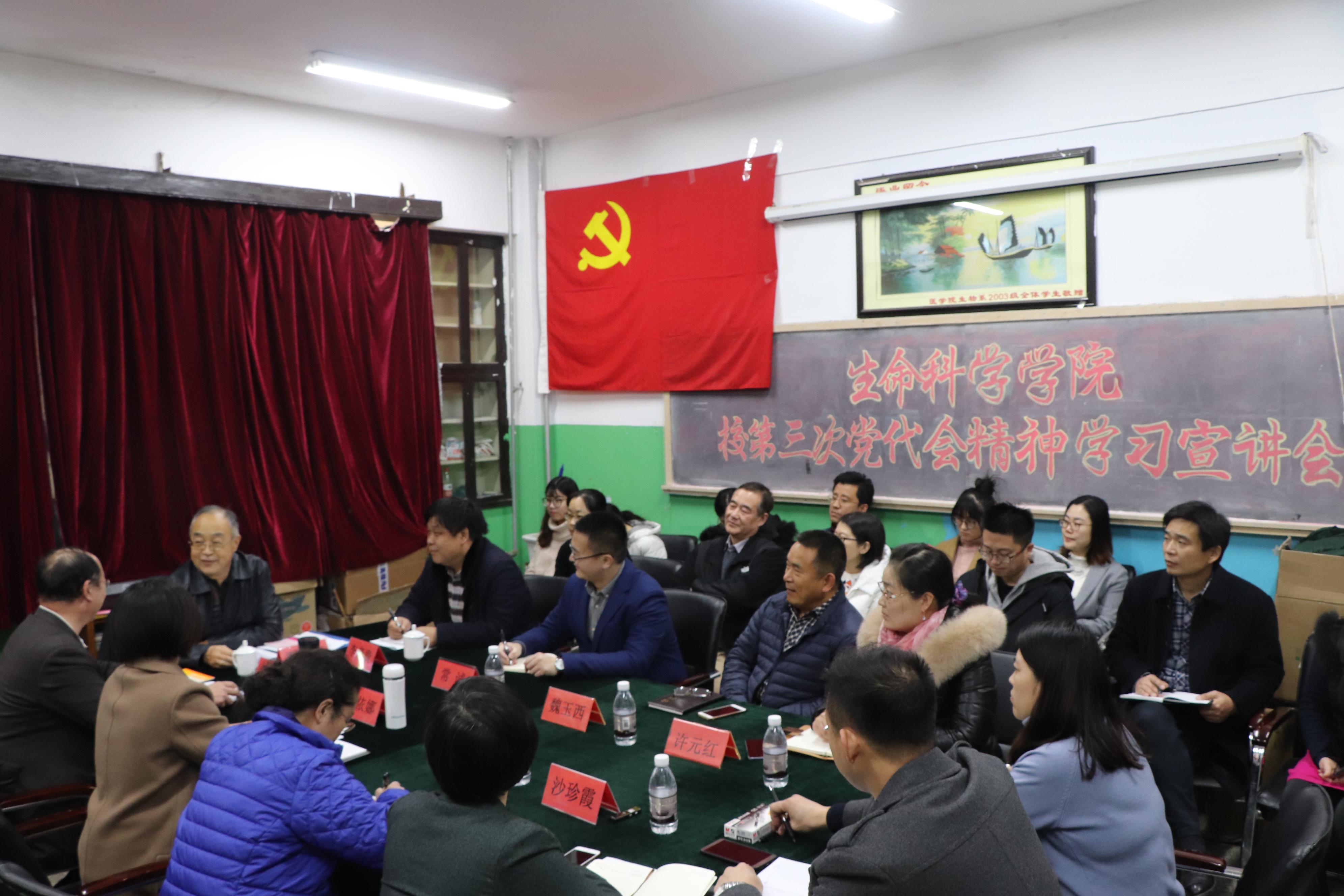 按照学校党委统一部署,12月19日下午2:00,校党委常委、纪委书记贾洪江同志到美女av 向学院全体教职员工和全体学生党员进行了校第三次党代会精神宣讲,就党代会报告的构成、新时代学校的历史使命与办学思路和未来五年的重点任务与举措,尤其是“十大工程”做了详细而生动的阐释。贾洪江强调,校党委书记胡金焱同志在党代会上所做的工作报告通篇贯穿了习近平新时代中国特色社会主义思想和十九大、全国教育大会等中央有关会议精神,既体现了上级要求,又符合美女av 实际,对推动今后一个时期美女av “双一流”建设,谱写新时代高水平大学建设新篇章具有重要指导作用,一定要认真学习、反复学习。要把深入贯彻学校第三次党代会报告精神与学习习近平总书记在庆祝改革开放40周年大会上的重要讲话结合起来,紧密联系学院的实际工作,人人明确目标任务,制定切实可行的具体措施,以保证党代会所提出的各项目标任务的完成;广大教职员工要努力提高能力素质,真正肩负起学院办大学的责任,为一流学科、一流大学建设作出应有的贡献;要不断加强作风纪律建设,积极营造干事创业的良好氛围;要勇于担当、主动作为,共促共享学校事业新发展,切实把党代会精神转化为深化改革、推动发展的具体方案和举措,为早日实现把美女av 建成在国内外有较大影响的一流大学的宏伟蓝图不懈努力。